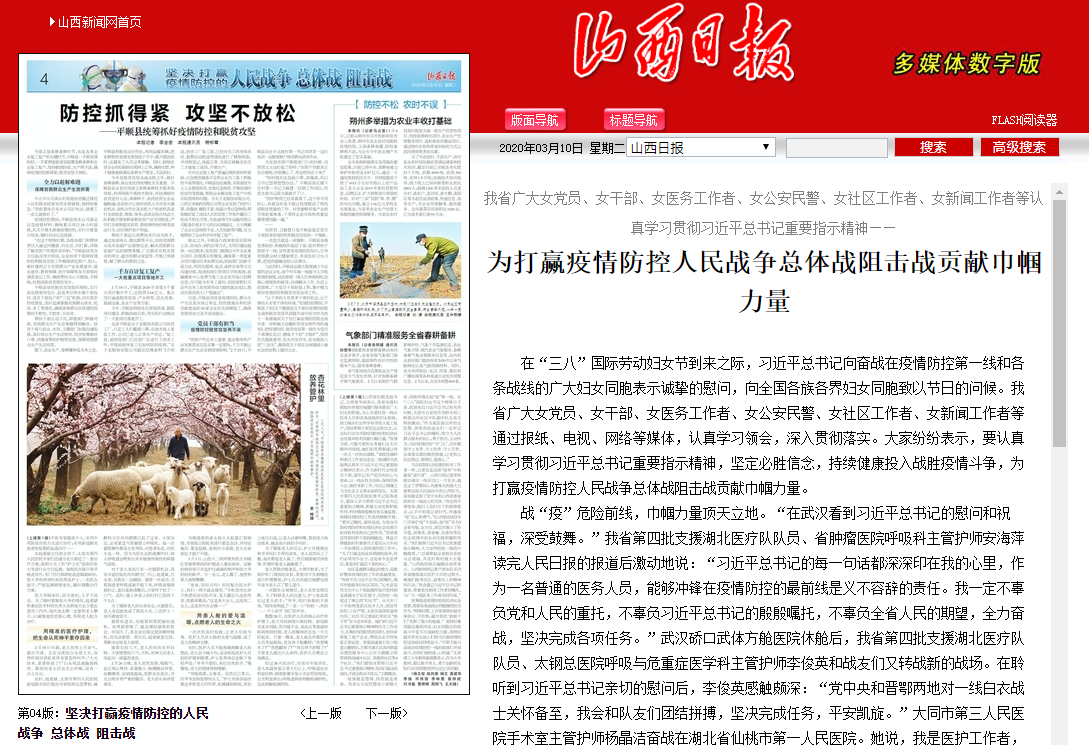 与在医院抗击疫情的医务工作者一样,记者也是这场“战争”中的最美“逆行者”。山西日报记者晋帅妮在湖北一线采访已一月有余,她见证了晋鄂同心共渡难关的强大力量和这场人民战役中的山西担当,深刻感受到了党中央和山西省委省政府对一线战士的关怀。“我定将不辱使命,践行入党时许下的铮铮誓言,以手中的笔记录时代,传递战‘疫’信心和勇气。”《山西政协报》专门开辟《“疫”不容辞,战“疫”有为》全彩专版,全方位、深层次展示了孙平莲、洪维英、郭春梅、吴春玲等在抗击疫情中的生动实践和履职风采。“我们按照习近平总书记的重要指示精神,大力宣传防疫一线的巾帼典型,广泛凝聚起全省政协系统众志成城、共克时艰的强大正能量。”山西政协报总编辑岳丽萍表示。山西新闻网记者卢奕如在采访我省驰援湖北医护人员的过程中,被他们挺身而出、迎难而上的精神所打动,“我会谨记习近平总书记的要求,带着党对新闻工作者的嘱托,与广大一线医务工作者共同作战。”